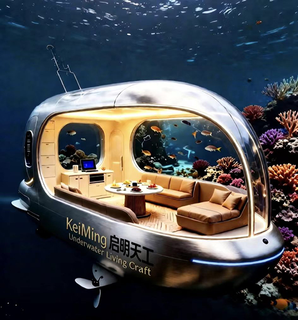 “KeiMing启明天工”是一款集深海探索、生态观测与高端居住体验于一体的模块化水下自航式旅居舱。其流线型钛合金外壳与全景穹顶设计,既保障结构强度,又最大化海底景观视野。舱内配备智能温控、循环水处理系统及低光生态照明,支持单人至家庭规模的短期驻留(最长5-30天)。通过可拆卸式推进器与锚定系统,可灵活部署于珊瑚礁区等生态海域,实现“零扰动”海洋科研与沉浸式度假的双重目标。